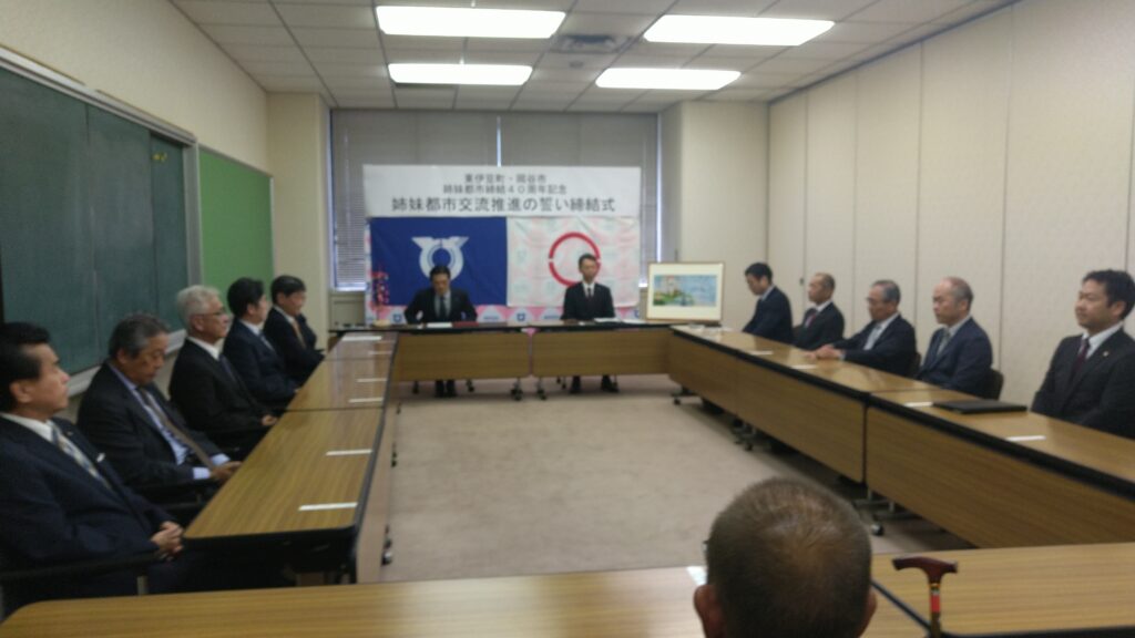 令和7年10月4日東伊豆町役場において、「東伊豆町・岡谷市姉妹都市40周年記念式典が開催されました。